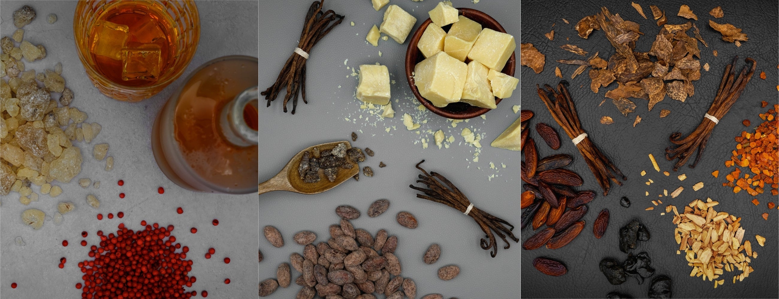 Eine dunkle Vanille, getragen von edlem kambodschanischem Oud, das Tiefe und Struktur verleiht und den Duft über den gesamten Verlauf begleitet zunächst präsent, später weicher und harmonisch eingebettet.